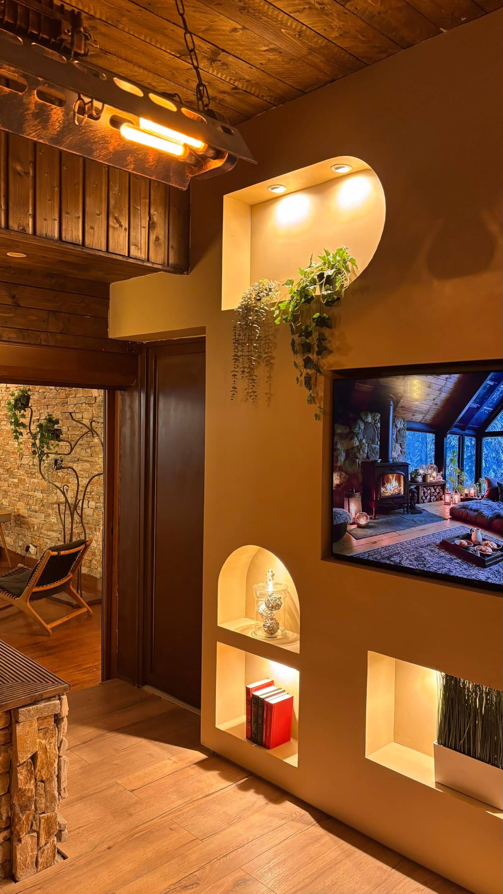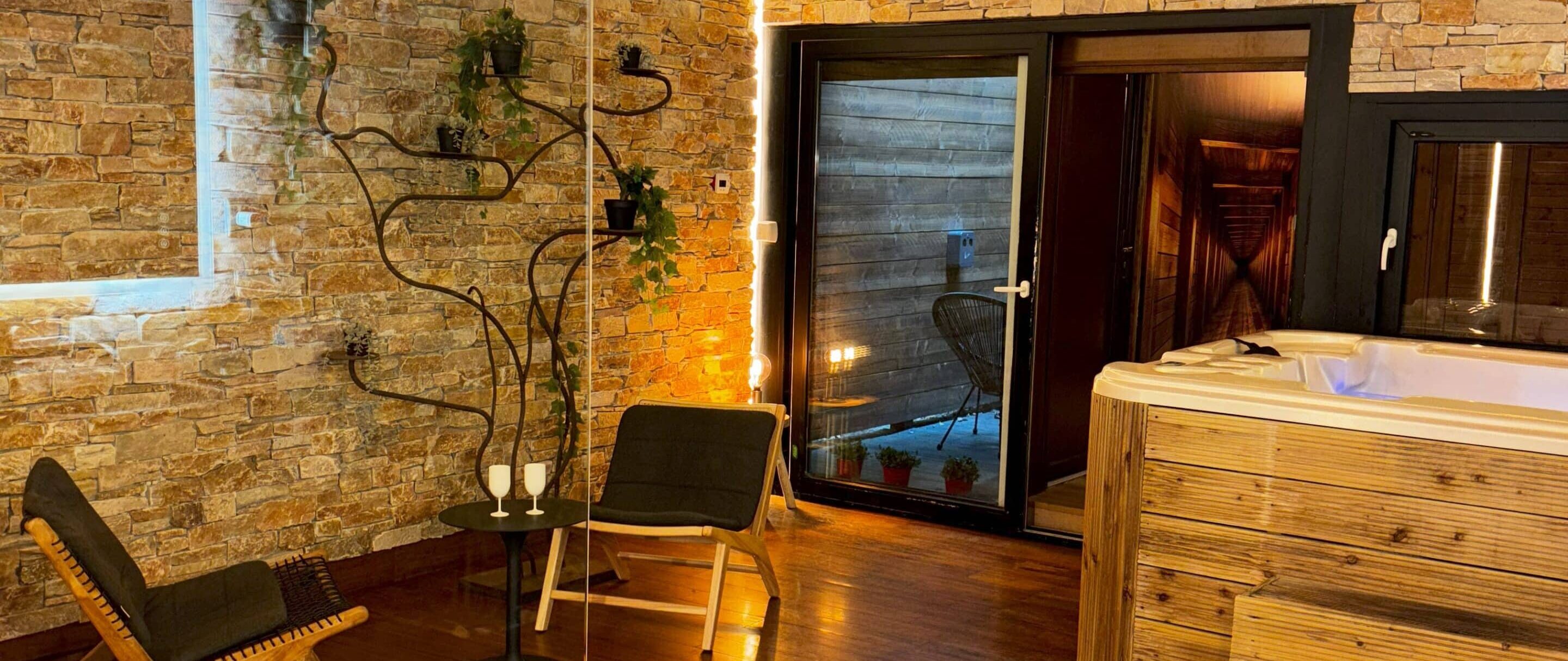 - La pièce d’eau : la chaleur du parquet massif, le mur en pierre naturelle, le Jacuzzi privatif et le sauna font que dès qu’on y entre on s’y sent bien